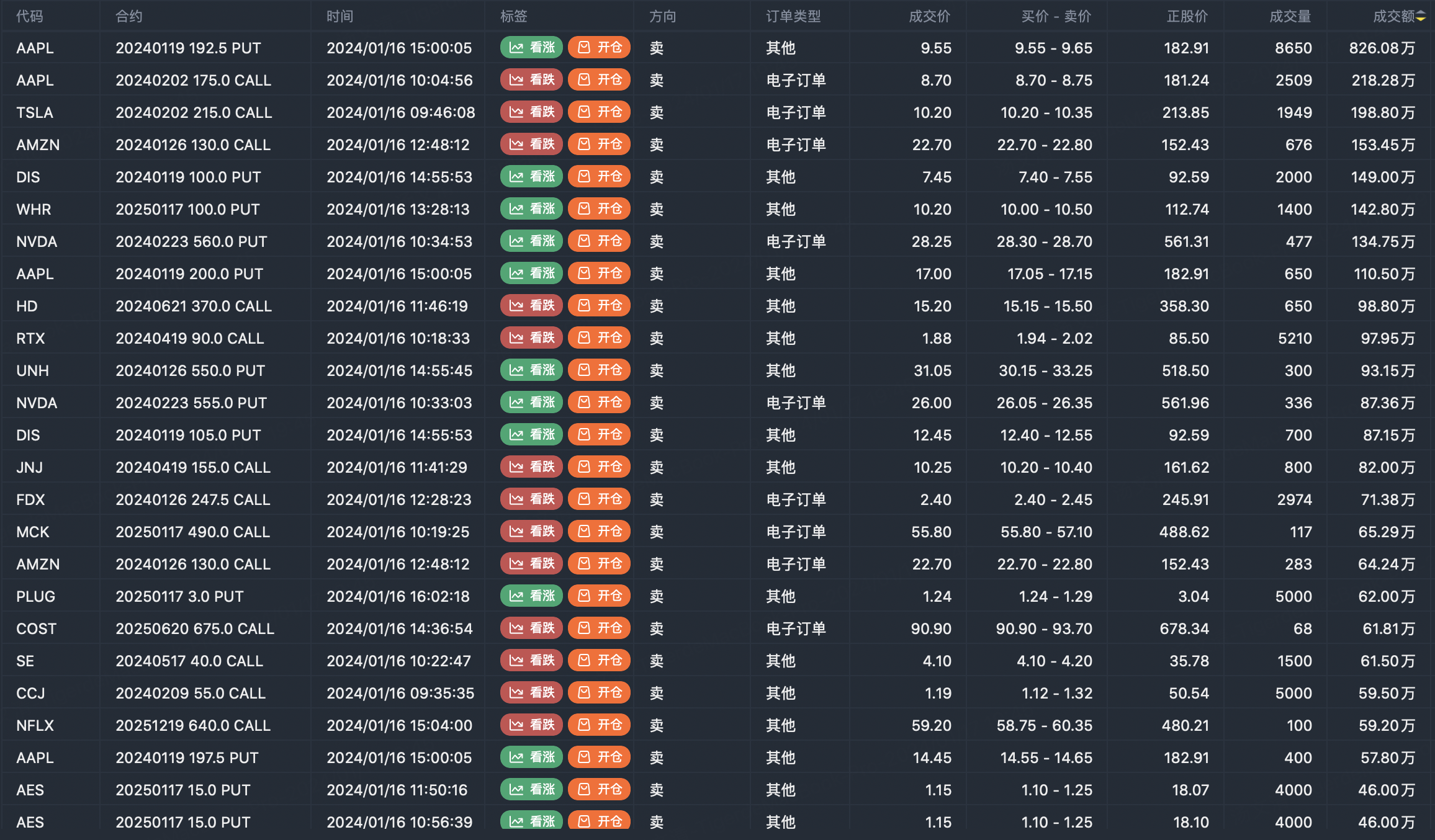 Note: This image data is from Tiger PC. This screen is a significant sell open position for an option contract in the market. A sell of a call option means that the trader believes that the underlying trend has peaked, and a sell of a put option means that the trader believes that the underlying trend has bottomed. These contract openings typically indicate significant activity in the underlying stock, including whether the trader is willing to accumulate a long or short option position.