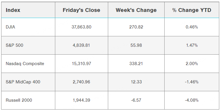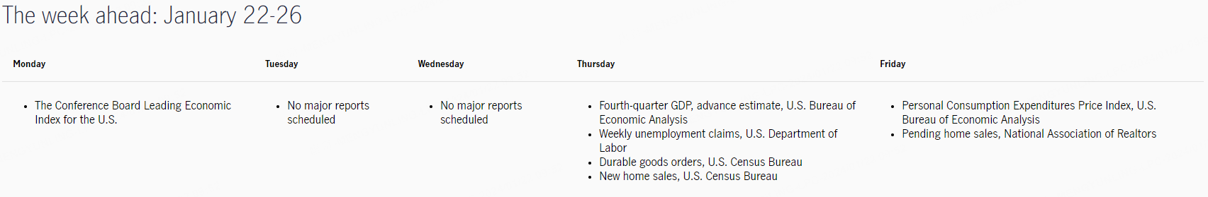 Stocks ended mostly higher over the holiday-shortened week, although the advance was narrowโan equally weighted version of the S&P 500 Index recorded a modest lossโand heavily focused on growth stocks. Information technology stocks outperformed, helped by a rally in semiconductor shares. Artificial intelligence (AI) chip giant NVIDIA was particularly strong, as was rival Advanced Micro Devices (AMD). Markets were closed Monday in observance of the Martin Luther King, Jr., holiday.