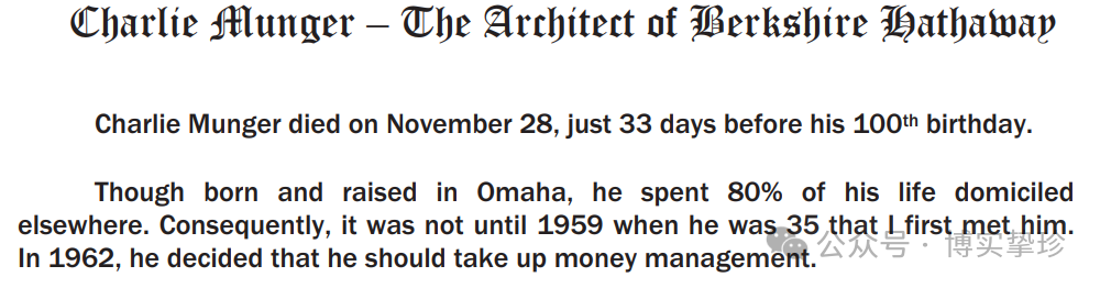 巴菲特在股東信之前,用特殊的字體,寫了一篇懷念芒格先生的文章。