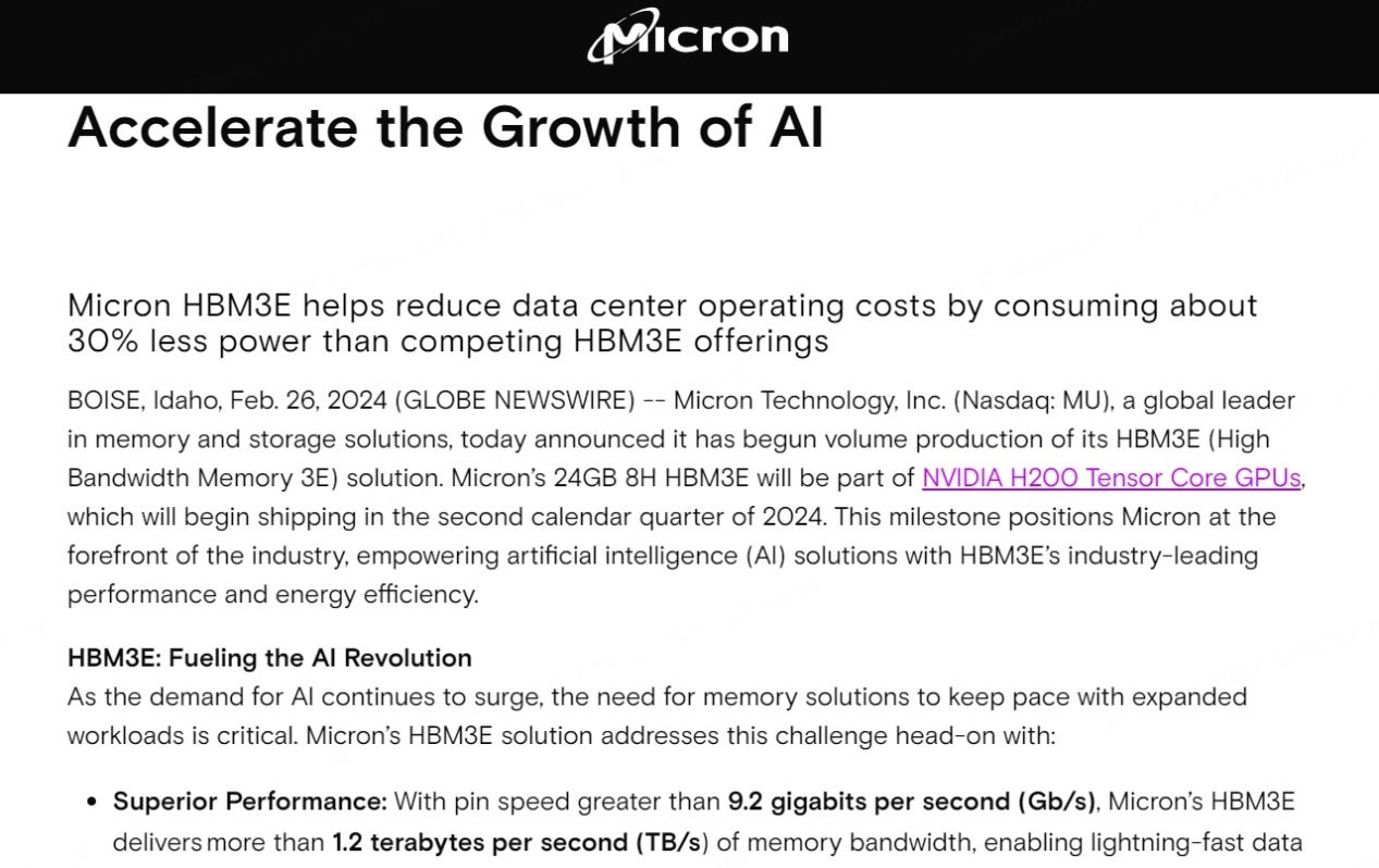 $Micron Technology(MU)$ , a memory chip giant, announced a blockbuster news yesterday. Its cutting-edge HBM3E product will start shipping in the second quarter of 2024.