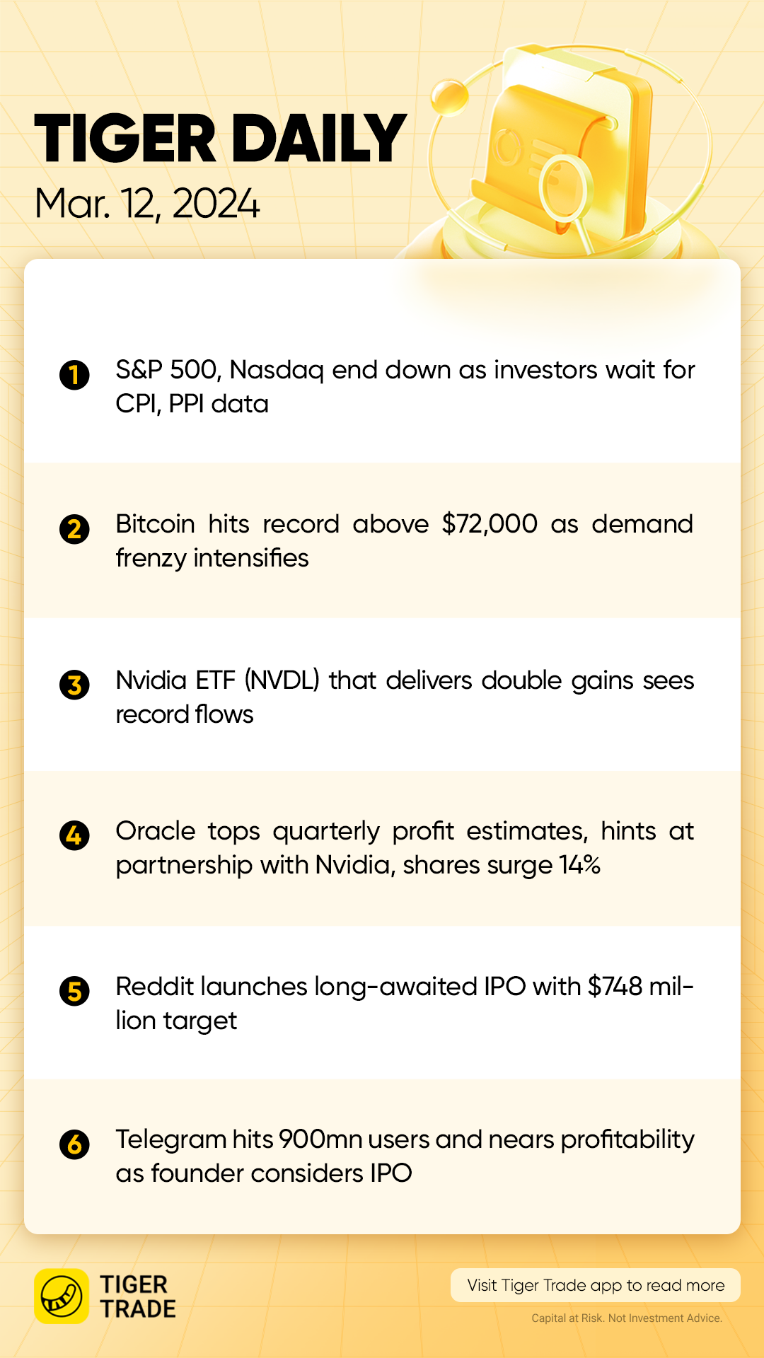 Coinbase ( $Coinbase Global, Inc.(COIN)$ ), MicroStrategy ( $MicroStrategy(MSTR)$ ) - Coinbase fell 1% and MicroStrategy rose 4.1% as the crypto-related companies reacted to Bitcoinโs moves. The worldโs largest cryptocurrency at last check was at $72,171.63, up 3.8% over the past 24 hours. It set a record high of $72,739 earlier.