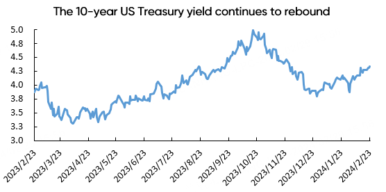Examining the trend of US Treasury yields, the market was initially overly optimistic about the Federal Reserve cutting rates, causing the yield on 10-year US Treasuries to temporarily drop to 3.8%. However, following the Federal Reserve's stance in the January FOMC meeting that there would be no rate cuts in March, coupled with unexpectedly high US inflation data and a resilient labor market, the market's expectations of rate cuts continued to be disappointed, leading to a significant increase in US Treasury yields.