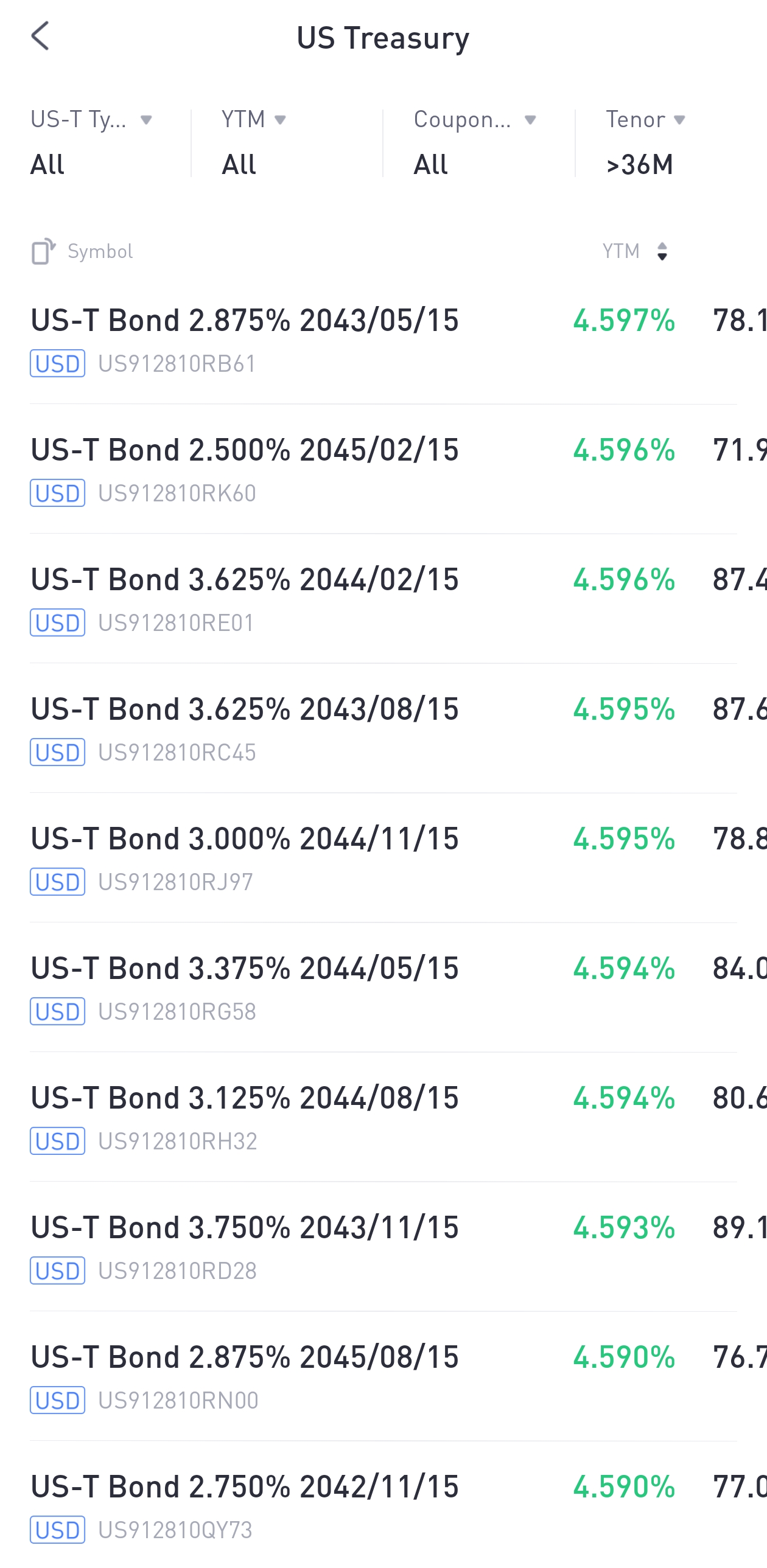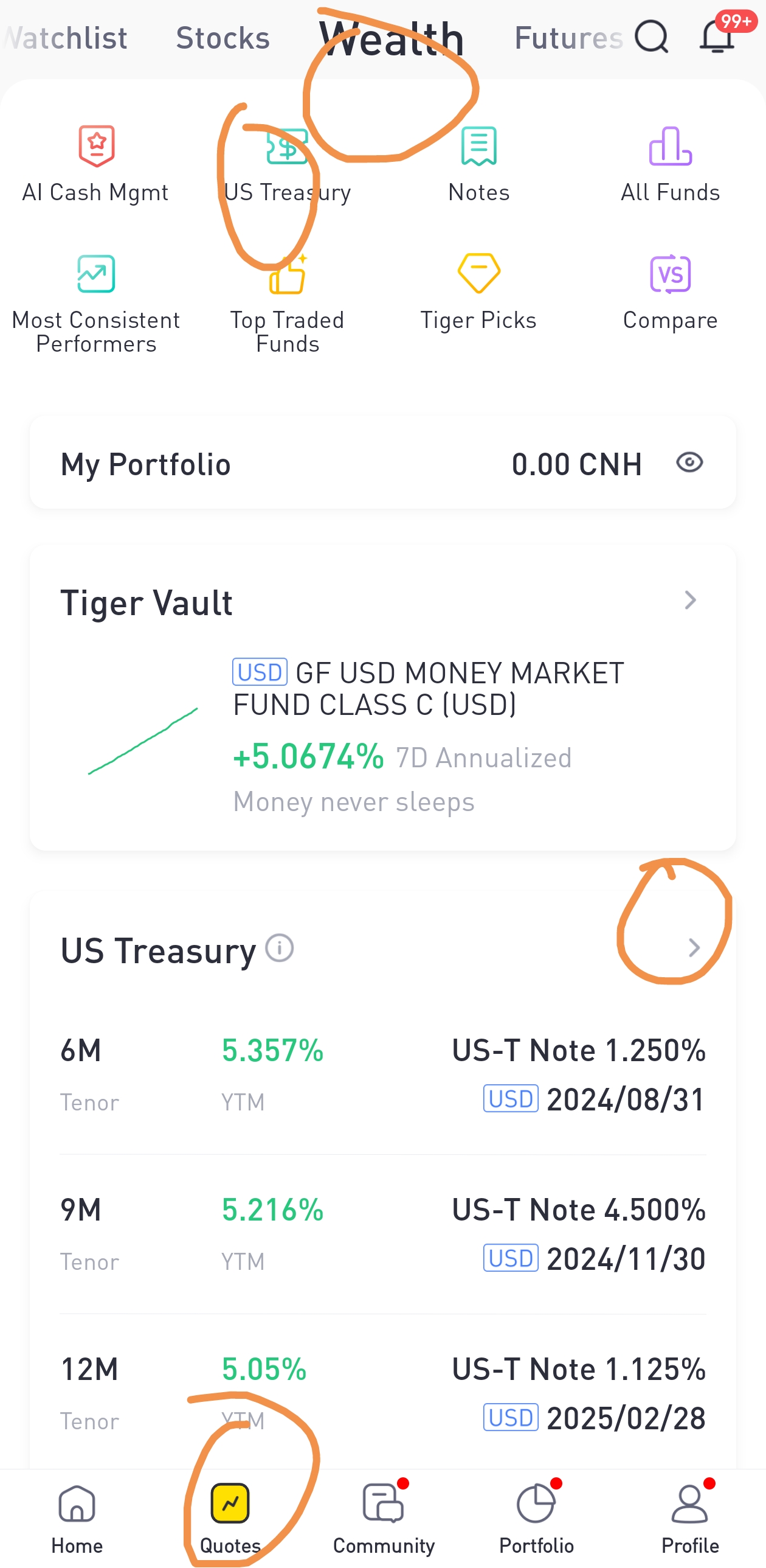 It's straightforward. Open the Tiger Trade app, click on "Quotes," then select "Wealth," followed by "US Treasury." Choose a maturity period of >36 months, and you will see a list of long-term Treasuries. Just choose the one that aligns with your preferences from the list.