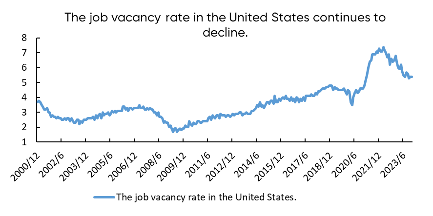 However, the Federal Reserve's persistent high-interest rates have to some extent suppressed corporate demand for labor. As the labor gap gradually narrows and job vacancy rates show a declining trend, labor market tension has eased somewhat.