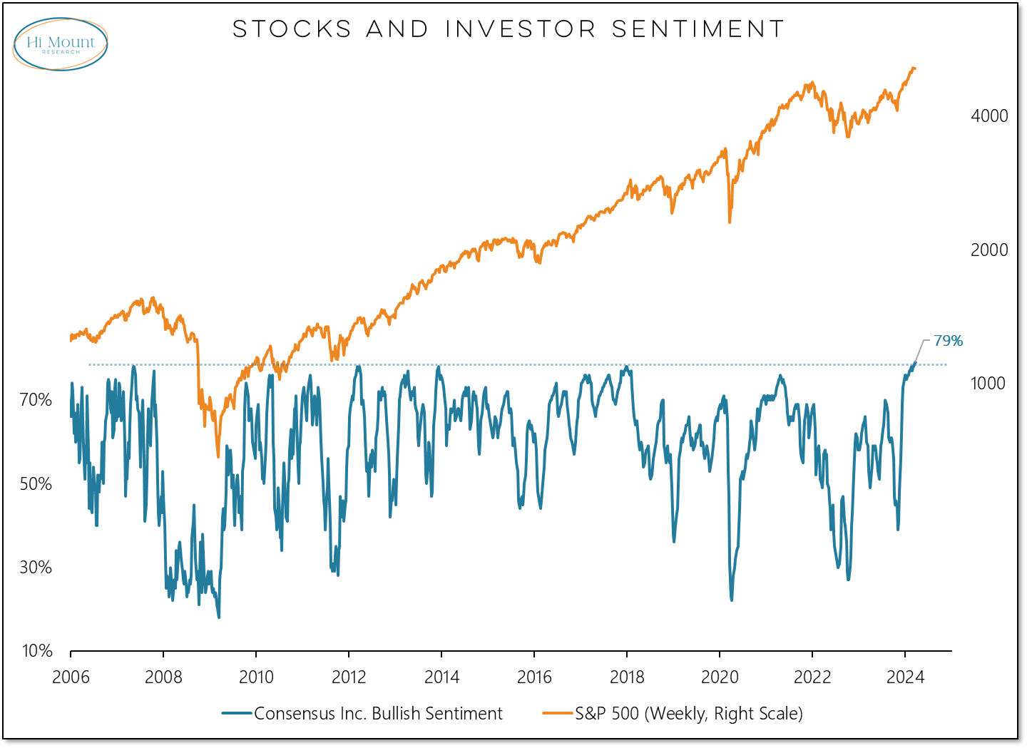 The Consensus Inc. Bullish Sentiment Index — known by practitioners as “Consensus Bulls”, pretty much says it all in that name. Almost 80% of market analysts surveyed by Consensus Inc. are bullish.