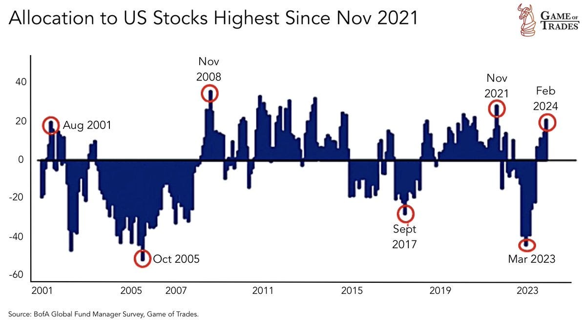 Larger investors are also going with the bullish flow — BofA Fund Manager survey shows allocations to US equities is now at the highest level since Nov 2021.