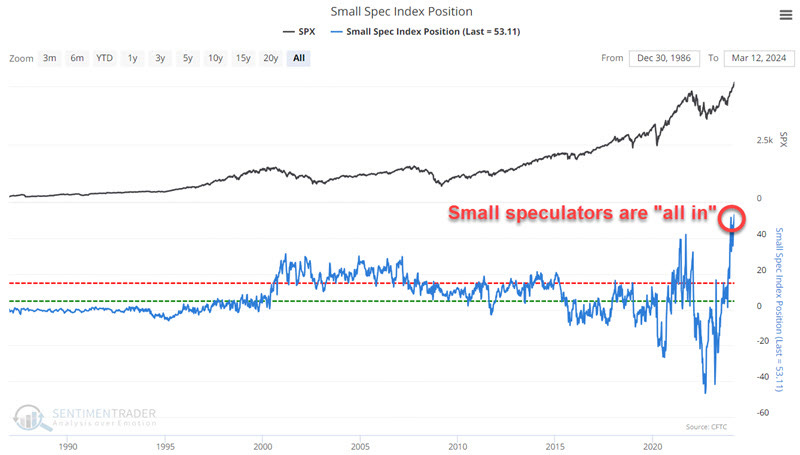 Small speculators in stock index futures have reached their most bullish net position ever. Consistent with the previous survey charts.