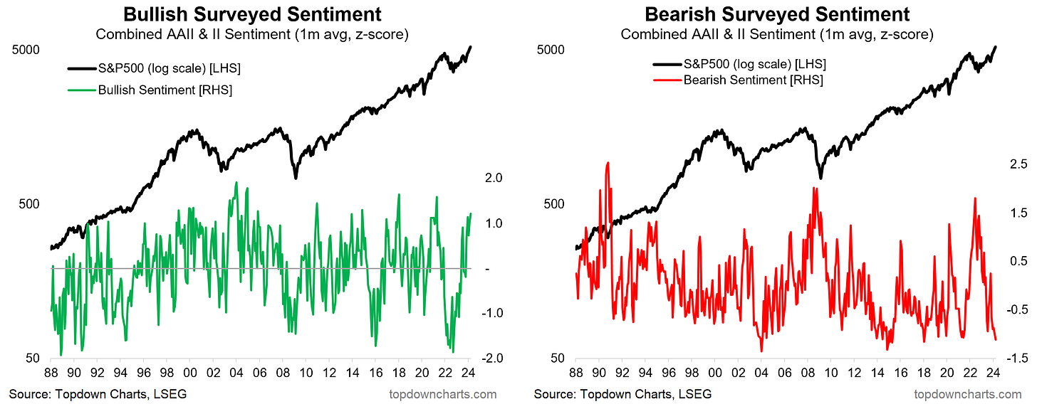This pair of charts shows the path of bulls and bears in the AAII and II surveys (longest running sentiment surveys) — they show at once, how the current cyclical bull market emerged (from the previous collapse in bullishness and surge to rare heights in bearishness)… but also the current state of things: despite a vocal minority, most people are bullish, and bears are gone.