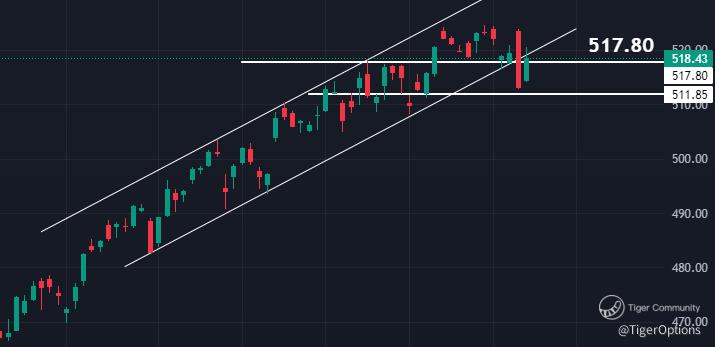 The $SPDR S&P 500 ETF Trust(SPY)$ has been stuck in a trading range recently, which isn't necessarily a bad sign. However, there are a couple of things to watch out for. Last week, the SPY broke below an upward trend line (channel support). It then retested that level the next day but failed to hold, which could be a sign of weakness. If the SPY rejects the channel support again next week, there's a chance it could fall down to around $511. Overall, the SPY's direction is a bit uncertain. Keep an eye on how it behaves around that previous support level to see if it breaks through or bounces back up.