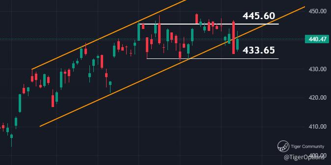 The situation with the $Invesco QQQ Trust-ETF(QQQ)$. is similar to the SPY. It's currently stuck in a trading range, making its near-term direction unclear.The QQQ isn't showing any strong signs of breaking up or down at the moment. The price sits right in the middle of its recent trading range. There are two key levels to keep an eye on: resistance at $445.60 and support at $433.65. A decisive break above resistance could signal a move higher, while a break below support could indicate a potential decline. For now, it might be best to adopt a wait-and-see approach with the QQQ. Observing how the price behaves around these key levels will provide a clearer picture of its next move.
