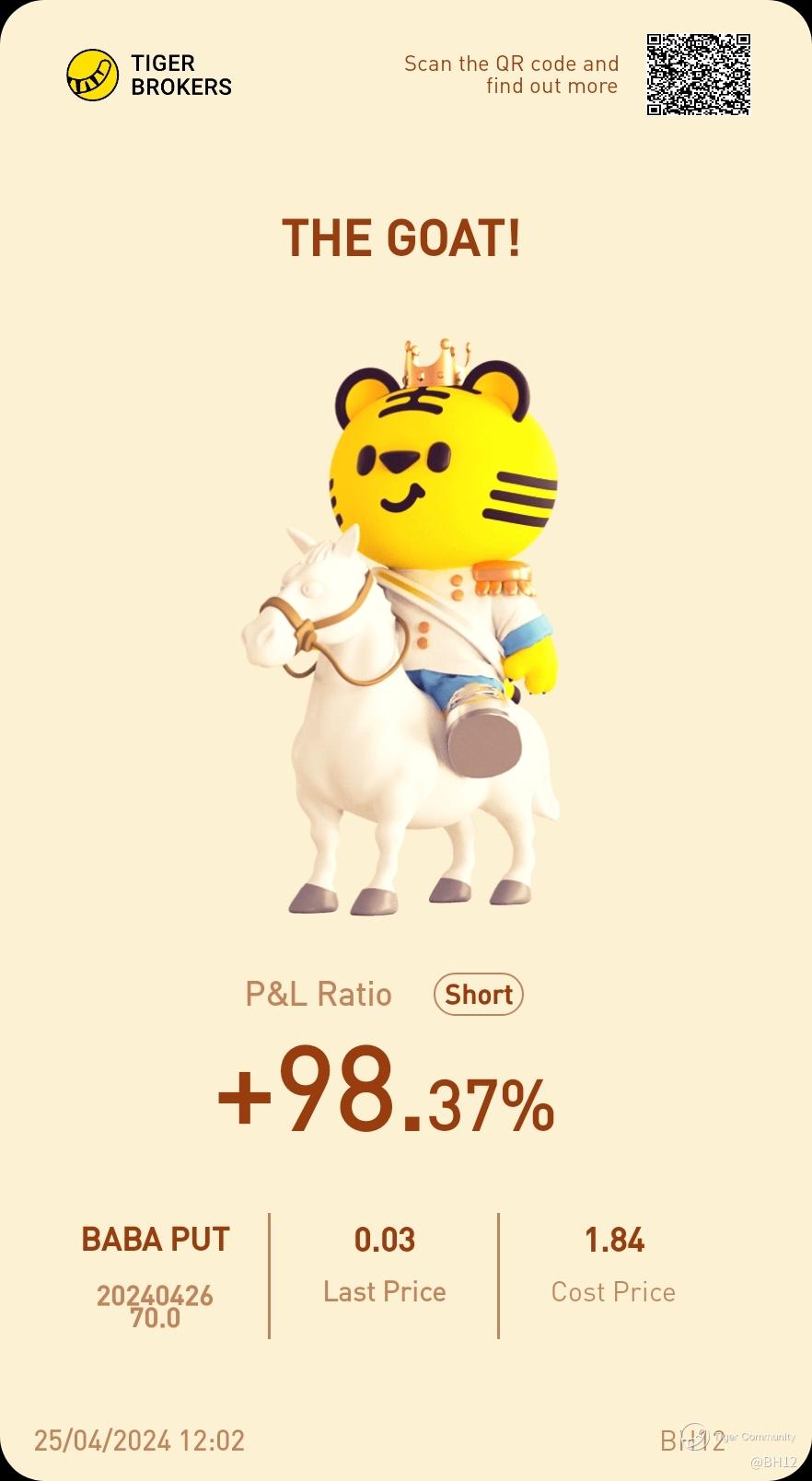 $BABA 20240426 70.0 PUT$ baba did it again. I have been selling puts from 68-70 for months now. Has a long term position on the shares, don't mind doubling down as cost base is high. Long term bull on baba story as china looks to emerge from the worst (repeatedly I know 😆)