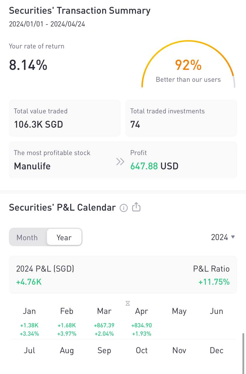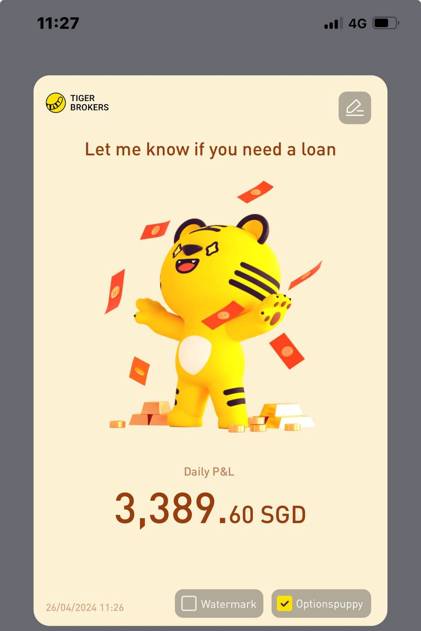 He exercises caution in position management by keeping half of his available cash in Tiger vault to safeguard against market crashes. Currently, he has achieved a year-to-date profit of SG $4.7K, with a goal this year of consistently generating $500~1K in stable monthly income!