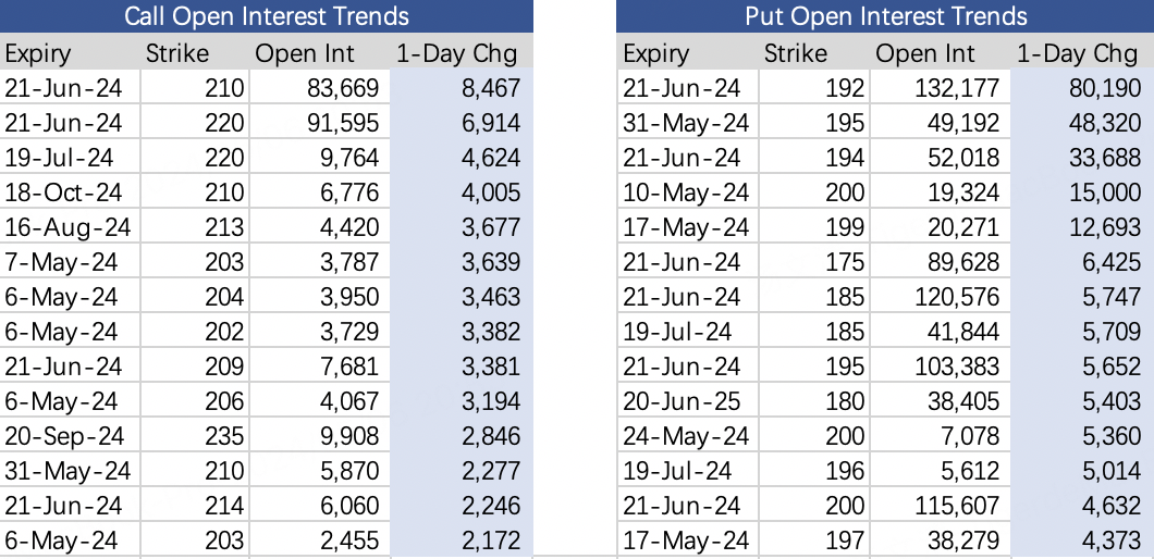 For put options, investors heavily bought the $IWM 20240621 192.0 PUT$  with a 192 strike, adding 80,000 contracts as part of a put spread with the $IWM 20240621 194.0 PUT$ . This signals expectations for IWM to remain in a 194-210 range, with downside limited to 3.4% by June 21 expiration.