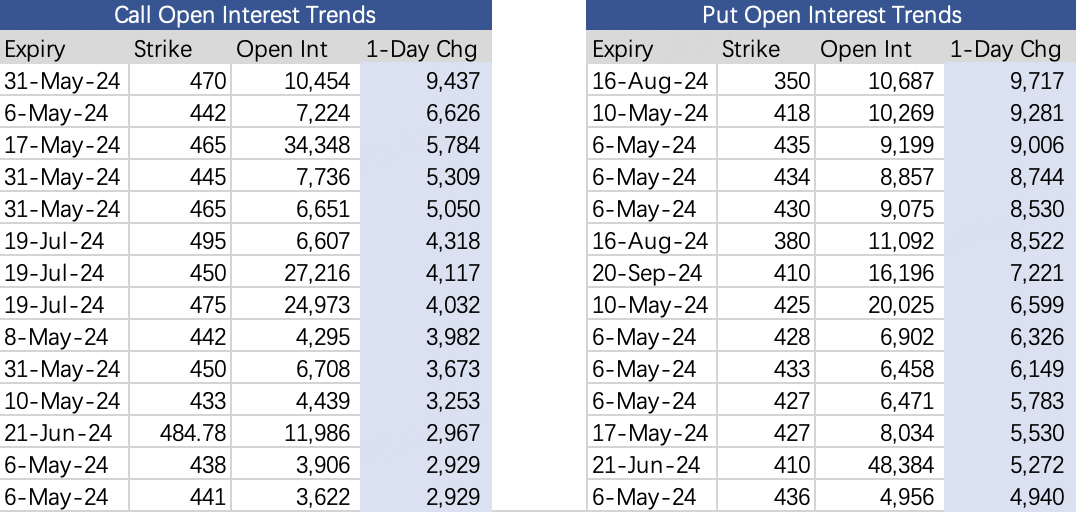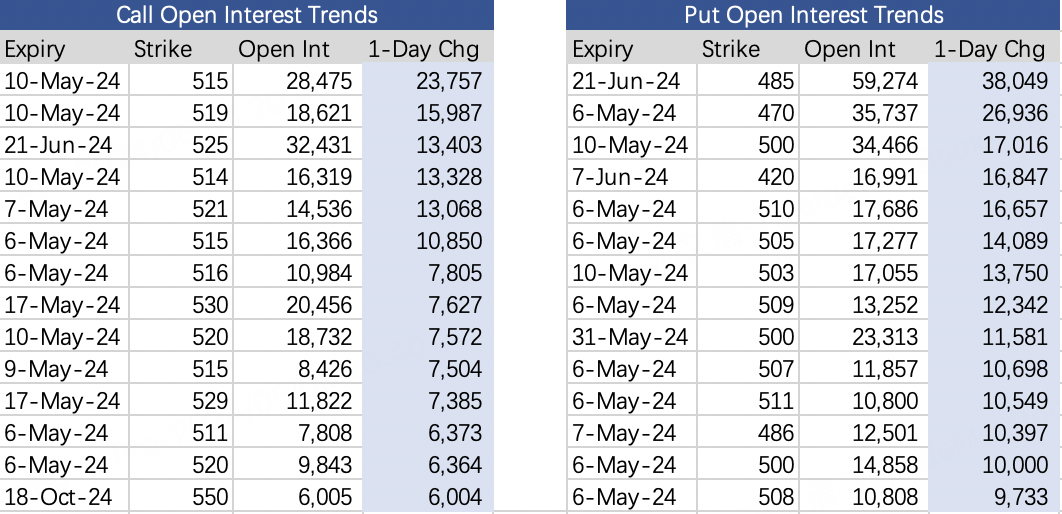 For call options, investors' largest opening position was the $SPY 20240510 515.0 CALL$  with a 515 strike, adding 23,000 contracts as part of a call spread with the $SPY 20240510 509.0 CALL$ . This implies expectations for the S&P 500 ETF to finish below 509 by May 10 expiration.