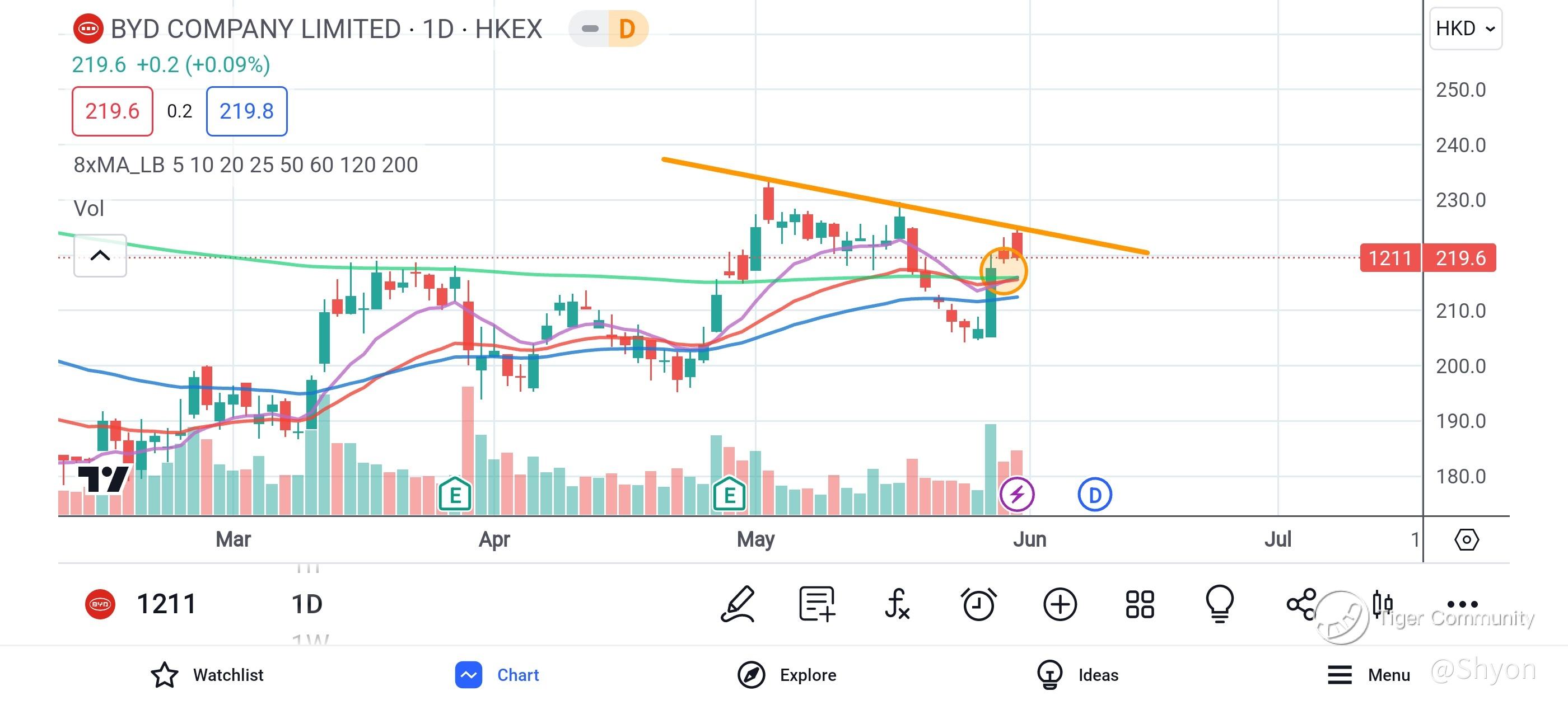 Let's look at Tesla chart above, just a long boring consolidation phase for the share price for the month of May. The good news is Tesla share price is able to stay close and above all its short to mid term EMA line (10; 25; 50). The near term support will be around 160 USD. For me, I continue to be bullish for $Tesla Motors(TSLA)$
