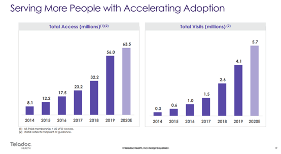 通過遠程醫療,醫生有了更多時間投入到看病中,患者有了更多機會治療慢性疾病,平臺有了更多用戶確立巨頭地位。從2014年以來,Teladoc的訪問量就開始不斷增加。
