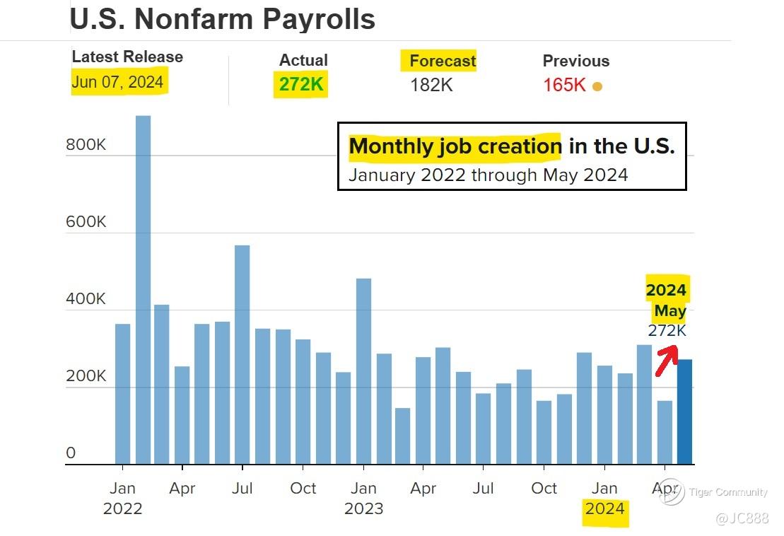 Nonfarm payrolls expanded by 272,000 for May 2024.