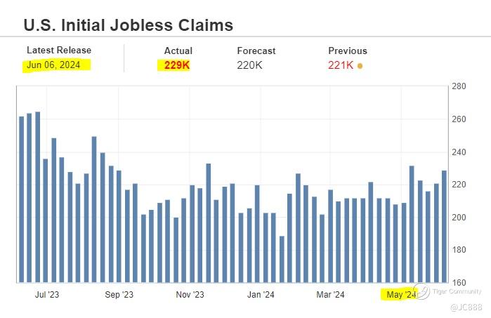 Jobless Claims Rise: Initial claims for unemployment benefits rose to 229,000, exceeding expectations (220,000 claims) by 9,000 claims or +4.09%, possibly indicating a potential increase in layoffs. (see below)