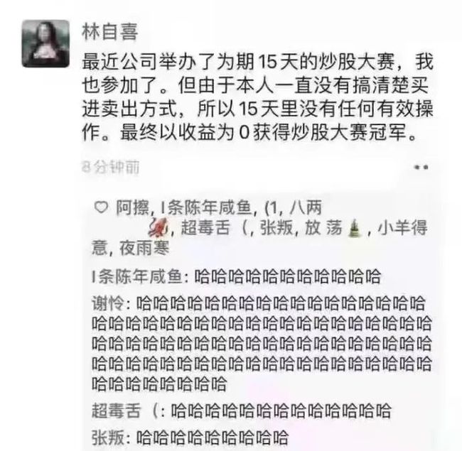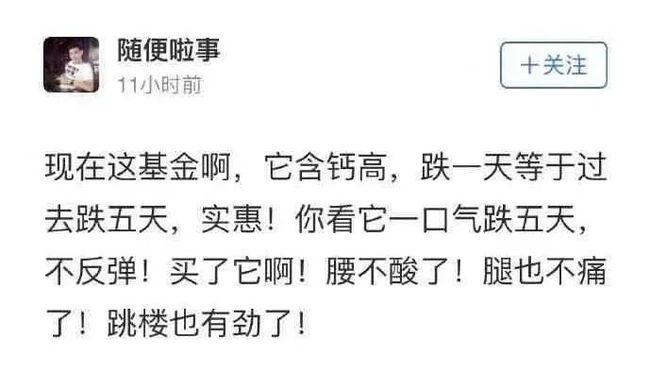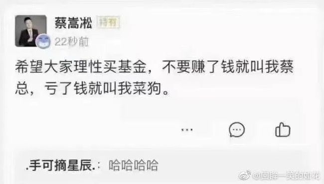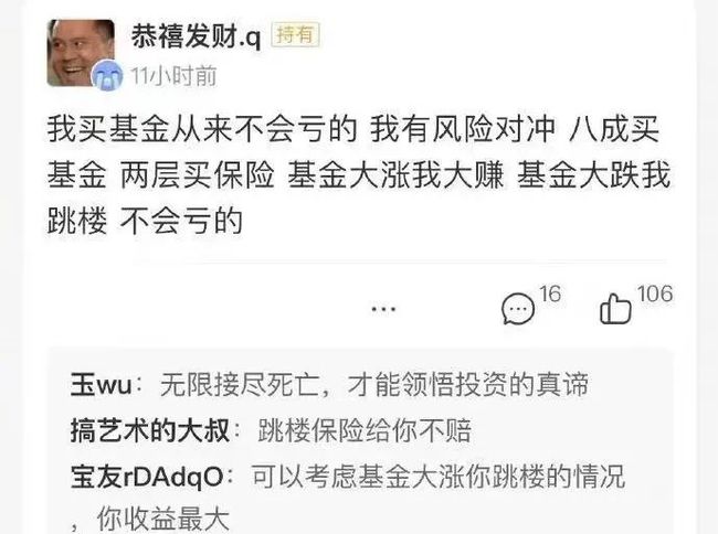 樂死我了,我天天蹲那看基金的段子,看着評論區每天一片嗚呼哀哉,一片透心涼心飛揚,每當一些朋友想大幹一場的時候,就會被大幹一場。