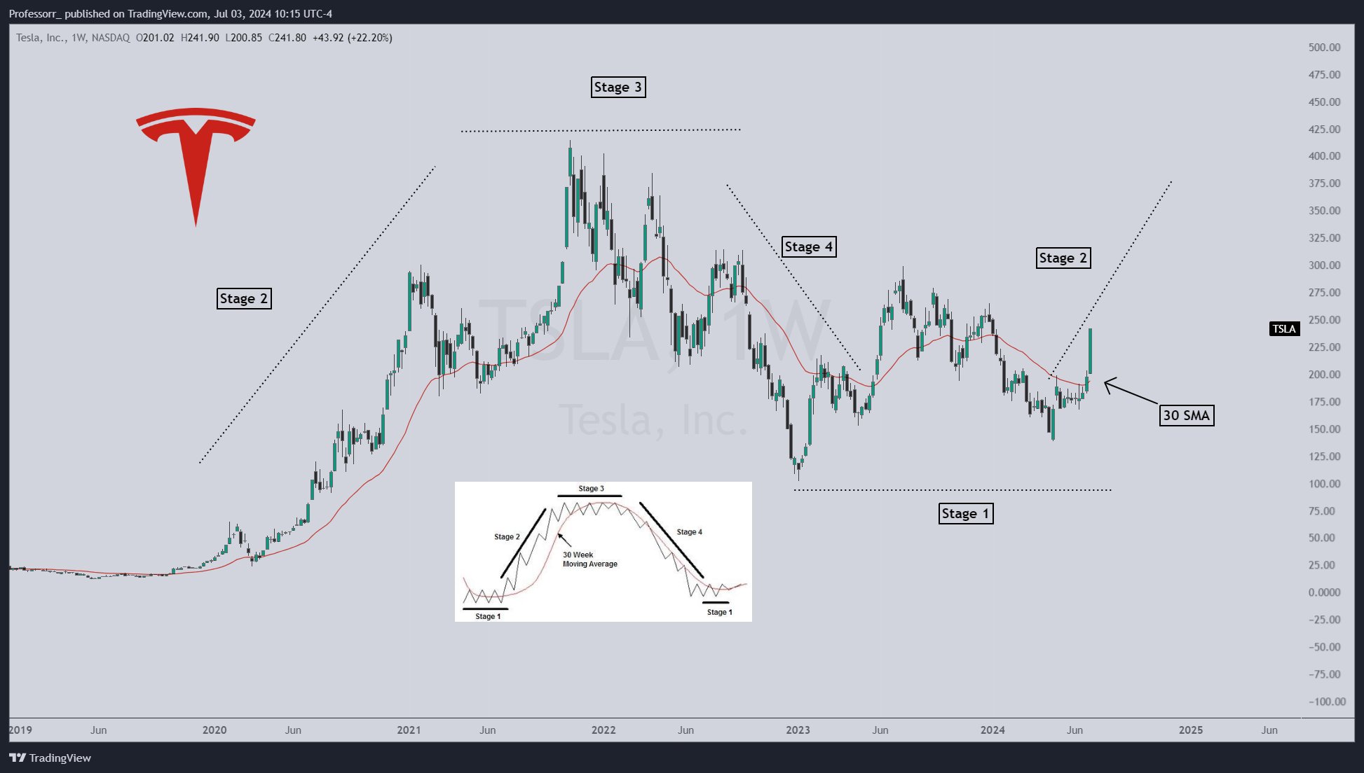 Hopefully $Tesla Motors(TSLA)$ Stage 2 breakout is coming. Price above 30week SMA And breaking out of downtrend patterns A stunning chart.