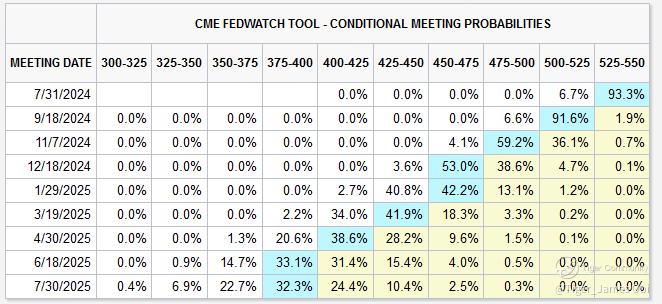 Traders now expect 3 rate cuts by the end of 2024, compared to only 1 rate cut expected one month earlier. There is a 90% chance of a September rate cut, up from about 70% earlier, while the probabilities of rate cuts in November and December are above 50%.