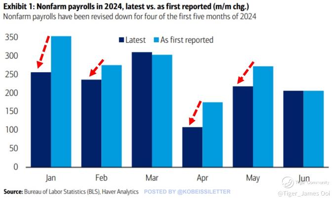 The US labor market initially added 165K and 272K jobs in April and May respectively, but recently, the non-farm payrolls were revised down to 108K and 218K for those months.