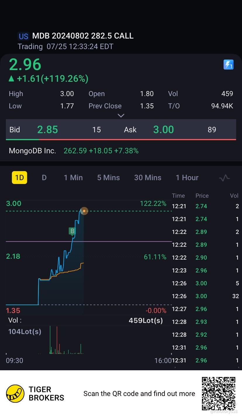 $MDB 20240802 282.5 CALL$ Went long MongoDb. Looks like momentum picking up