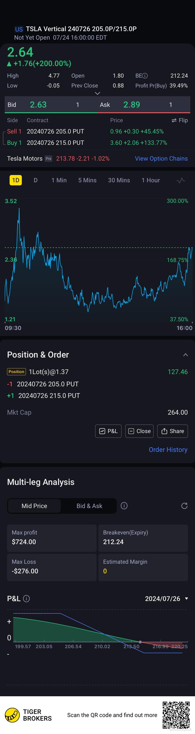 $TSLA Vertical 240726 205.0P/215.0P$ Shirt term bearish on Tesla. Strong support at 200. Decided to do a bear spread rather than an outright short. Might initiate a bullish call next week.
