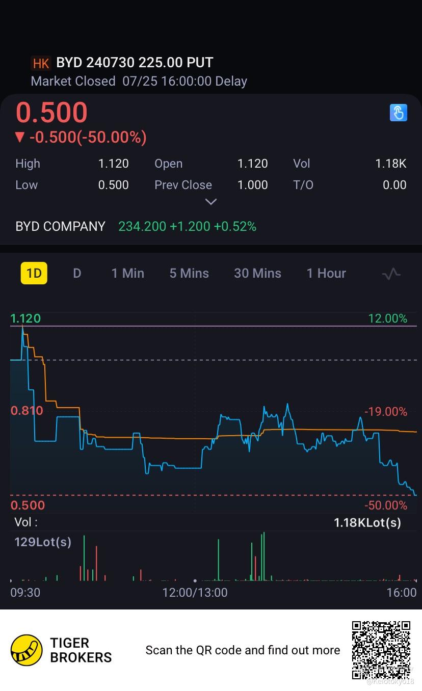 $BYD.HK 20240730 225.00 PUT$ Occasionally I like to take bets against the leader. Don't! 80% it doesn't work haha. School fees paid 😂