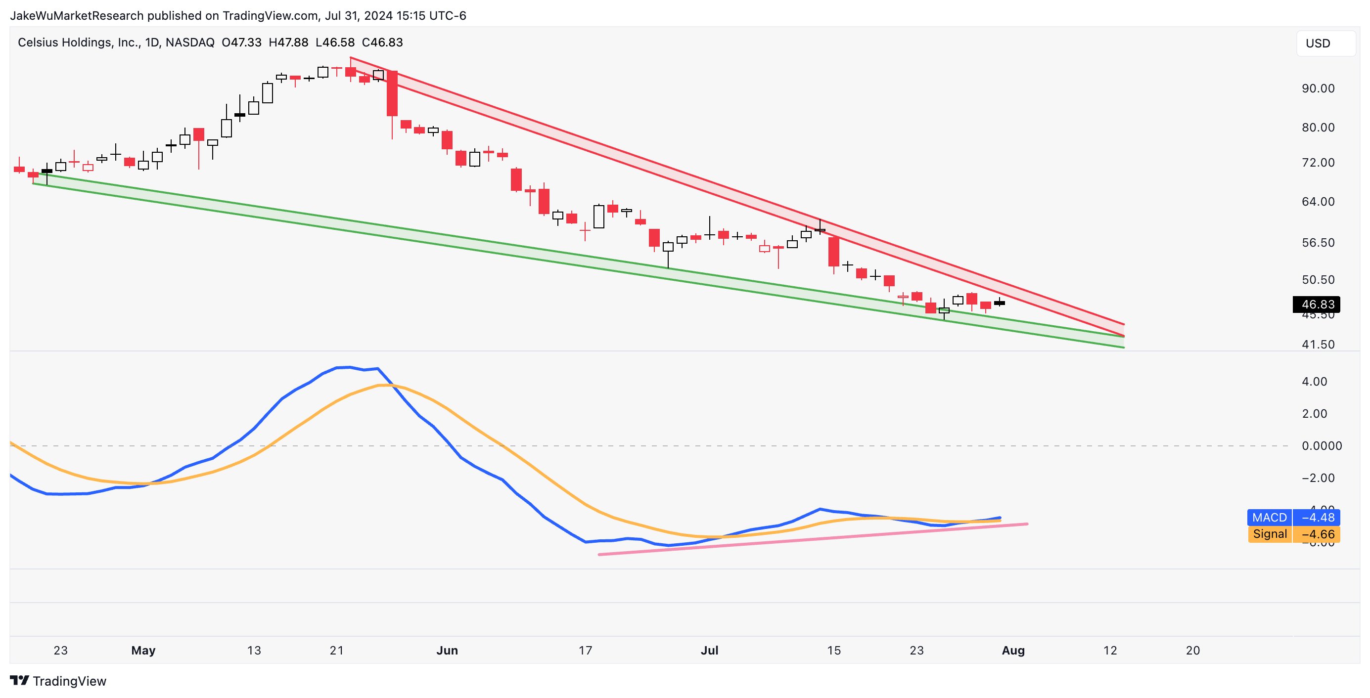 $Celsius Holdings, Inc.(CELH)$ Falling wedge setup as the MACD prints positive divergence & recently crossed to the upside.