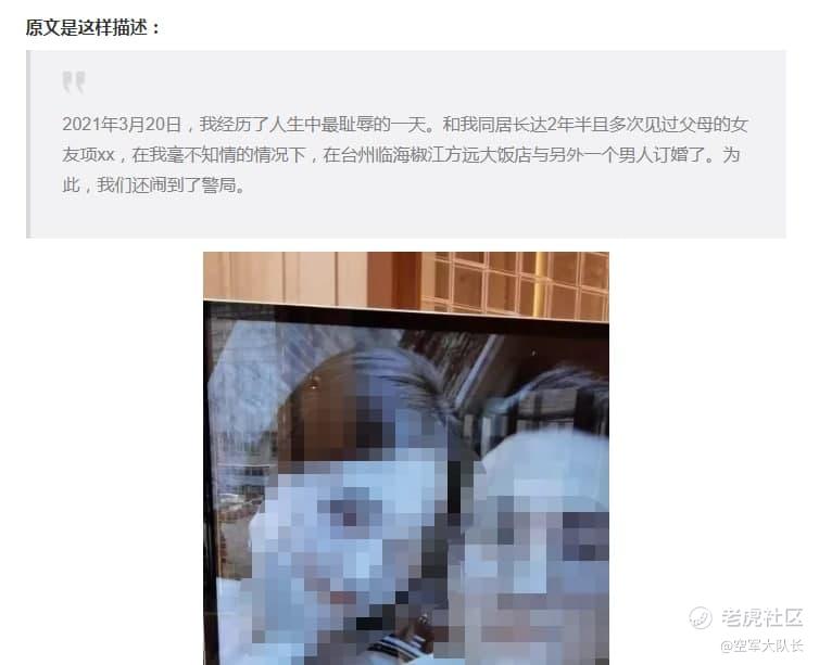 2021年3月20日,我經歷了人生中最恥辱的一天。和我同居長達2年半且多次見過父母的女友項思醒,在我毫不知情的情況下,在臺州臨海椒江方遠大飯店與另外一個男人(徐某某)訂婚了。爲此,我們還鬧到了警局,可笑吧。2021年3月20日,我的創業合夥人磊哥,他在臺州本地的朋友發現項思醒正在訂婚:“磊哥,這不是你家的主播,你朋友的女朋友嗎?她今天在臺州方遠大飯店訂婚”。