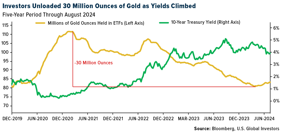 That’s exactly what happened. From the end of 2020 to May 2024, exchange-traded funds (ETFs) backed by physical gold shed approximately 30 million ounces, over a quarter of their total holdings, as yield-seeking investors pared back their positions.