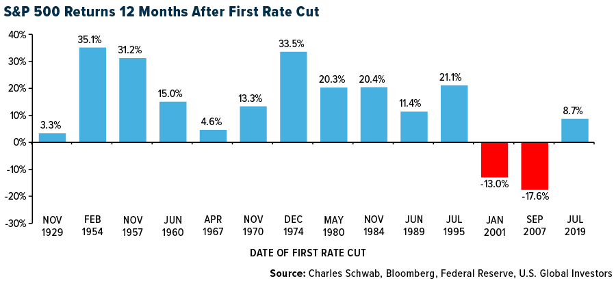 The stock market traded up 12 out of 14 times — or 86% of the time — a year after the Fed made its initial cut in a new easing cycle. Schwab points out that the two back-to-back negative periods were predicated on extraordinary circumstances: the dotcom bubble in 2001 and the housing crisis in 2007. Past performance is no guarantee of future results, but it’s worth considering.