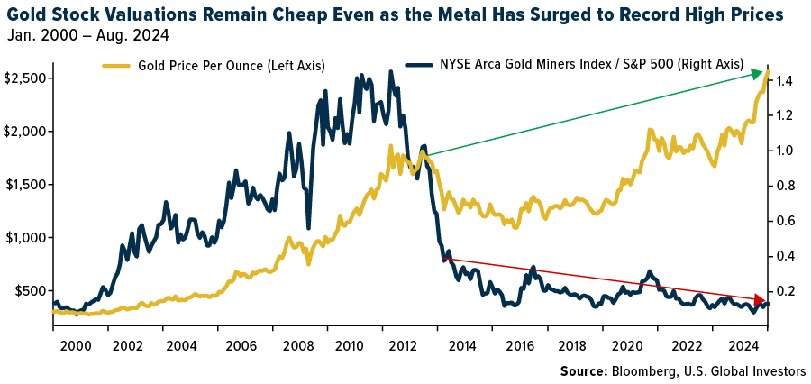 And yet, despite the bull run, gold stocks — those companies that mine, process and sell the metal — are trading at historically low valuations relative to the market.
