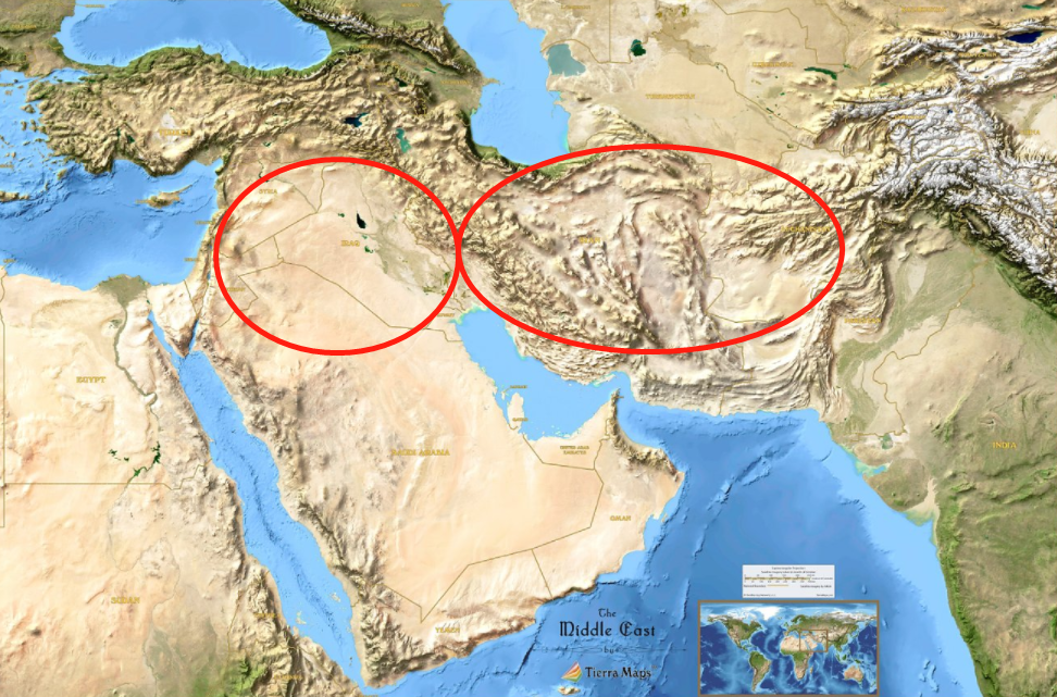 在15世紀拜占庭帝國滅亡、奧斯曼帝國崛起前,中東的政治和經濟中心,始終在兩個地方輪換:巴格達(巴比倫)和波斯高原,下面是中東的地形環境: