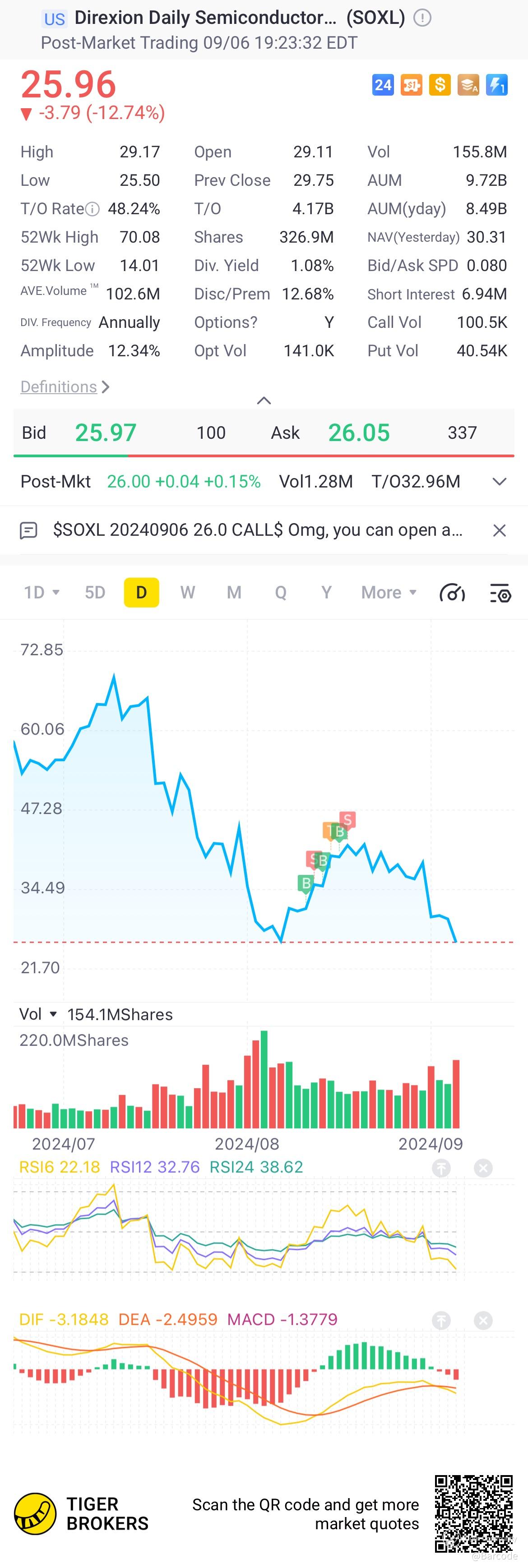 According to the information you provided, SOXL has experienced a significant decline of 12.76% to $25.96. The key levels to consider are: