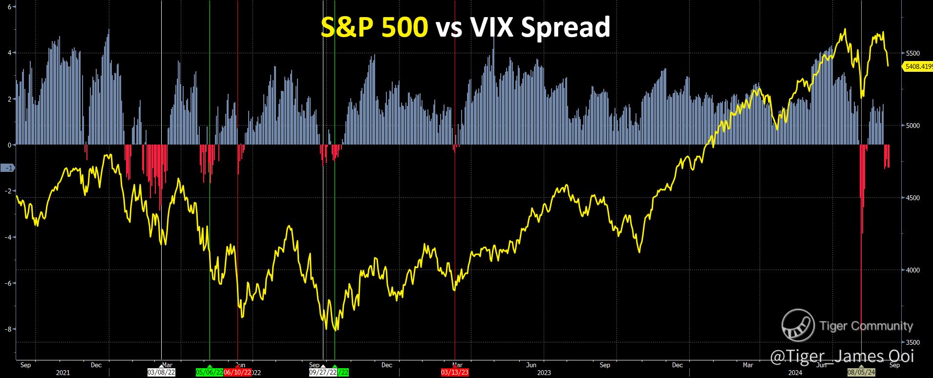 The VIX curve has inverted again since end August. The VIX spread now shows a negative reading, with VIX futures of longer maturities trading lower than those with shorter maturities, indicating that the S&P 500 is pricing in extreme near-term fear.