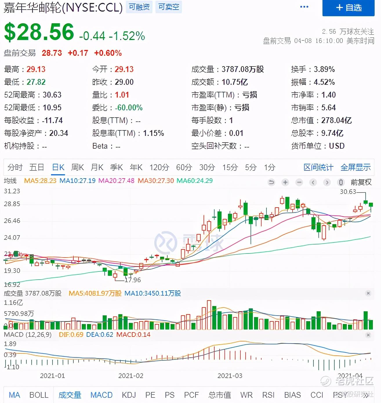 截至美東時間4月8日美股收盤,嘉年華郵輪股價下跌1.52%,報28.56美元。