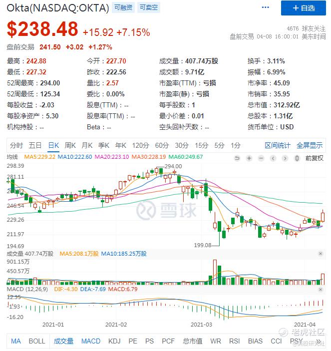 截至美東時間4月8日美股收盤,Okta股價上漲7.15%,報238.48美元。