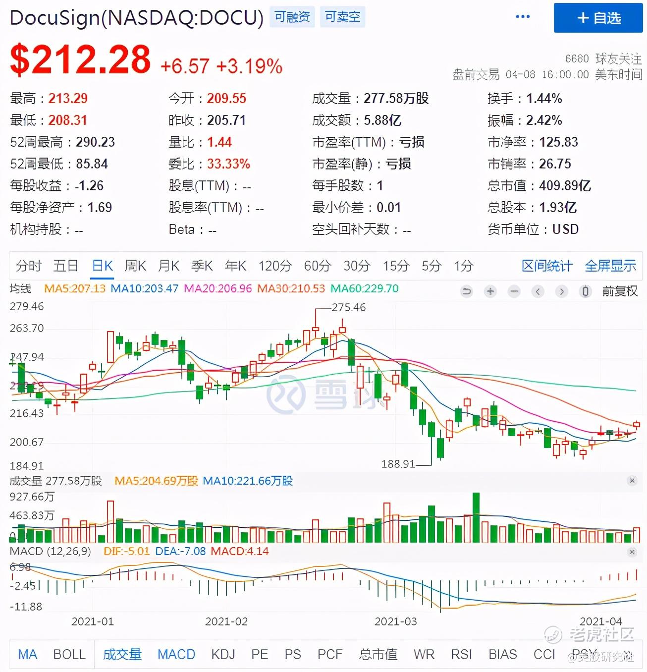 截至美東時間4月8日美股收盤,DocuSign股價上漲3.19%,報212.28美元。