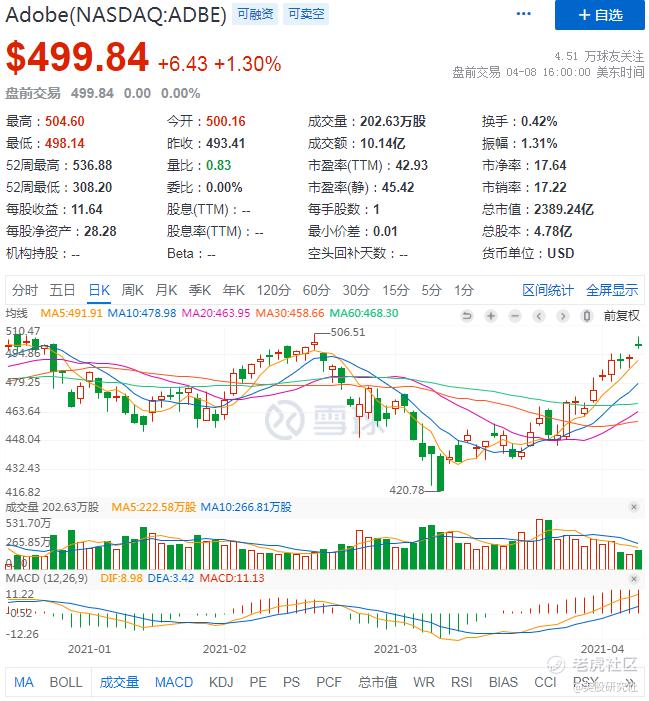 截至美東時間4月8日美股收盤,Adobe股價上漲1.30%,報499.84美元。