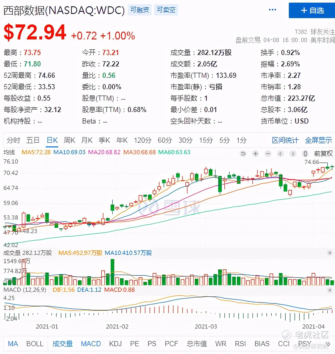 截至美東時間4月8日美股收盤,西部數據股價上漲1.00%,報72.94美元。