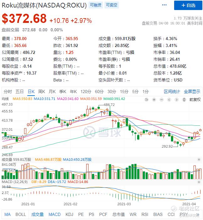 截至美東時間4月8日美股收盤,Roku股價上漲2.97%,報372.68美元。