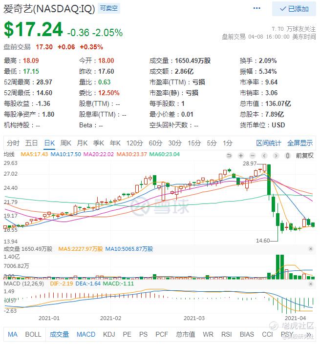 截至美東時間4月8日美股收盤,愛奇藝股價下跌2.05%,報17.24美元。