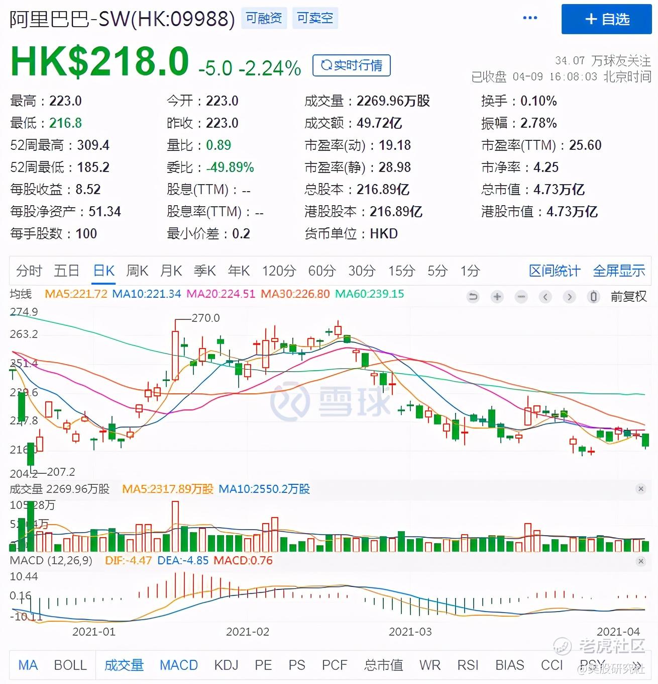 截至今日港股收盤,阿里巴巴股價下跌2.24%,報218.0港元。