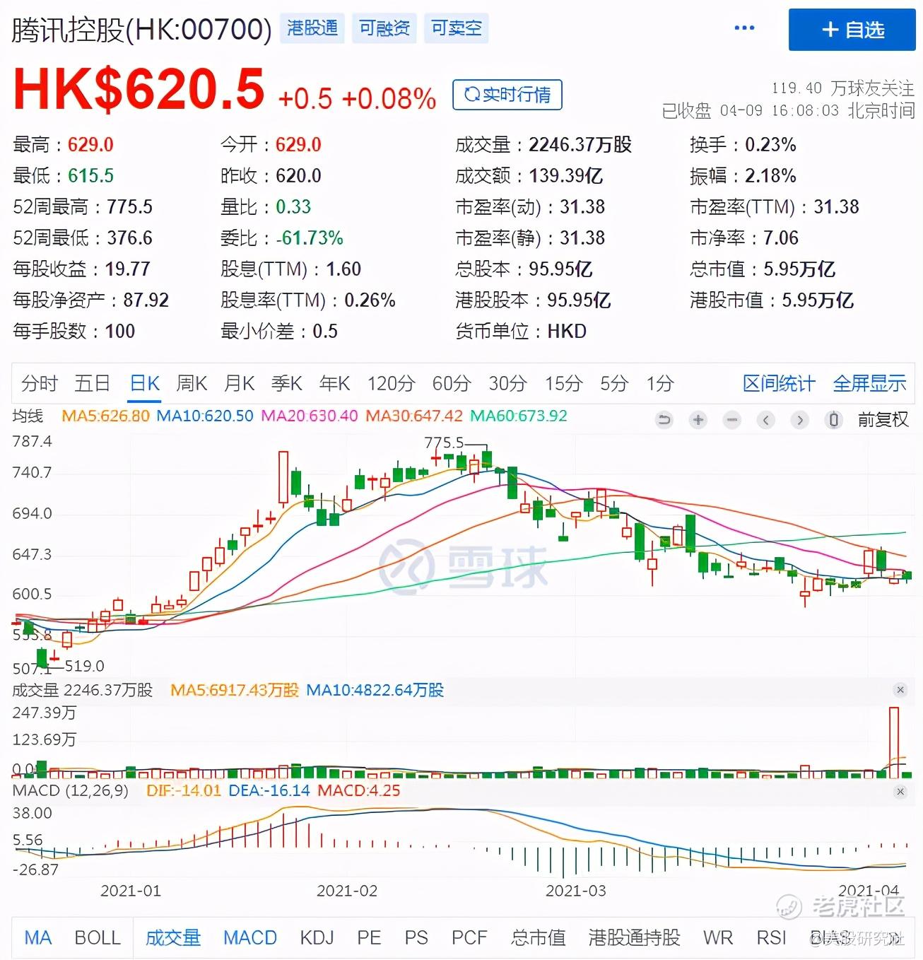 截至今日港股收盤,騰訊控股股價上漲0.08%,報620.5港元。