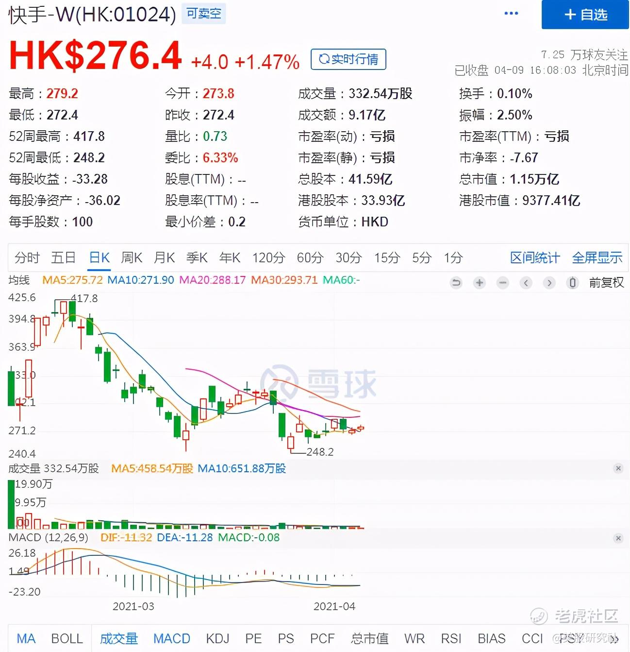 截至今日港股收盤,快手股價上漲1.47%,報276.4港元。
