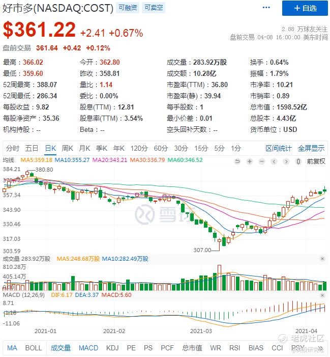 截至美東時間4月8日美股收盤,好市多股價上漲0.67%,報361.22美元。