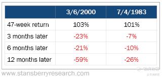 根據量化及歷史統計:納斯達克指數在歷史上連續47週上漲了兩次,漲幅也是剛剛高於100%。這兩次100%的上漲分別在2000年3月和1983年7月結束,納指在大幅上漲後立即表現巨糟。