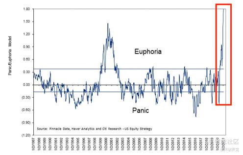 根據花旗集團(Citigroup)“恐慌/興奮”,該數據最近總體的樂觀情緒達到了21世紀初以來的最高水平。